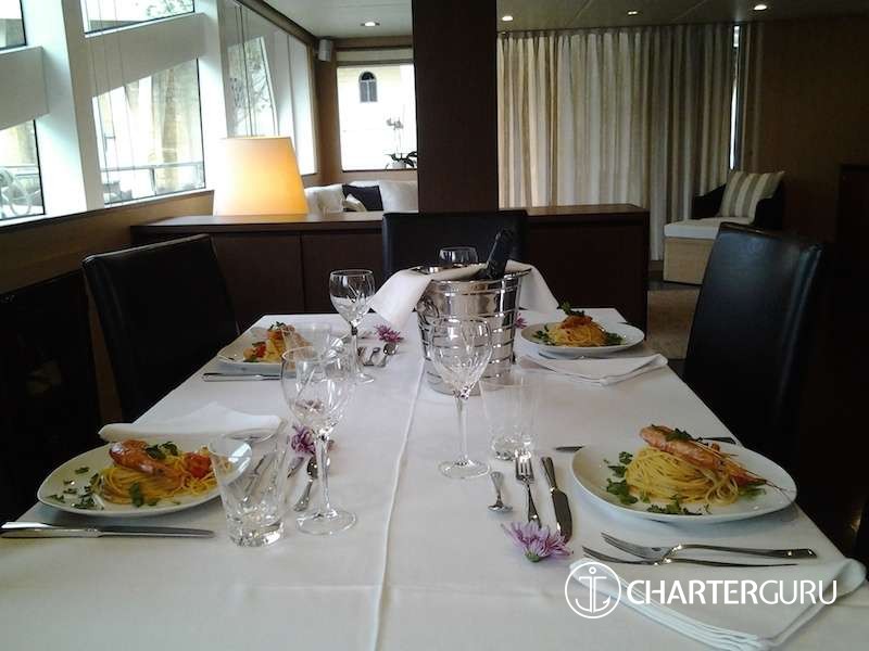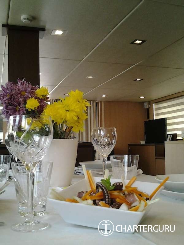 ARIA C is classified as a superyacht. The generous aft deck, is right next to the well-equipped and inviting main saloon. The main saloon is a friendly space that is well-equipped to shield from the elements in comfort and enjoyment and boasts a number of entertainment options. 5 welcoming cabins are thoughtfully spread out to allow for comfortable access and private setting.