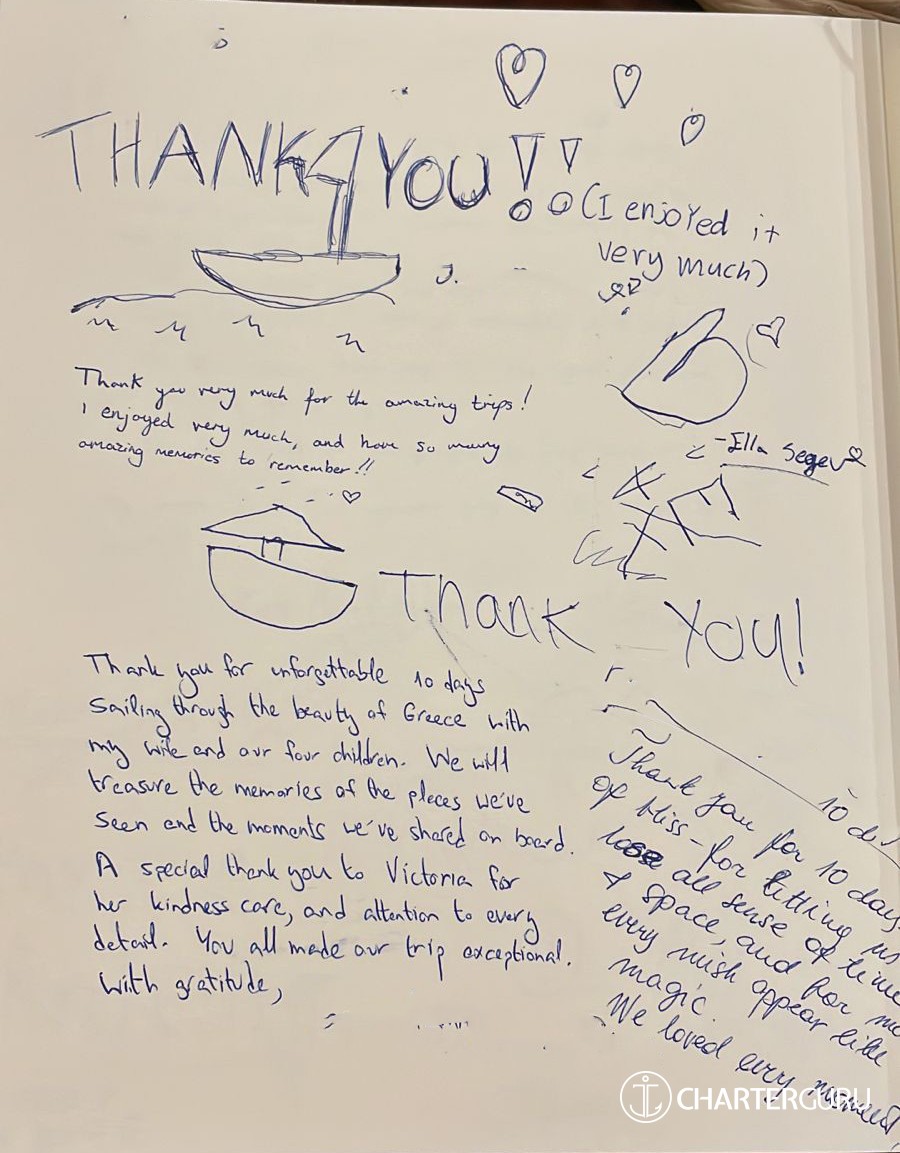 Thank you for the unforgettable 10 days sailing through the beauty of Greece with my wife and our four children. We will treasure the memories of the places we have seen and the moments wh have shared on board.