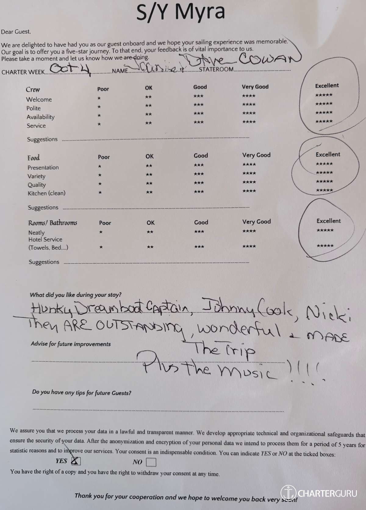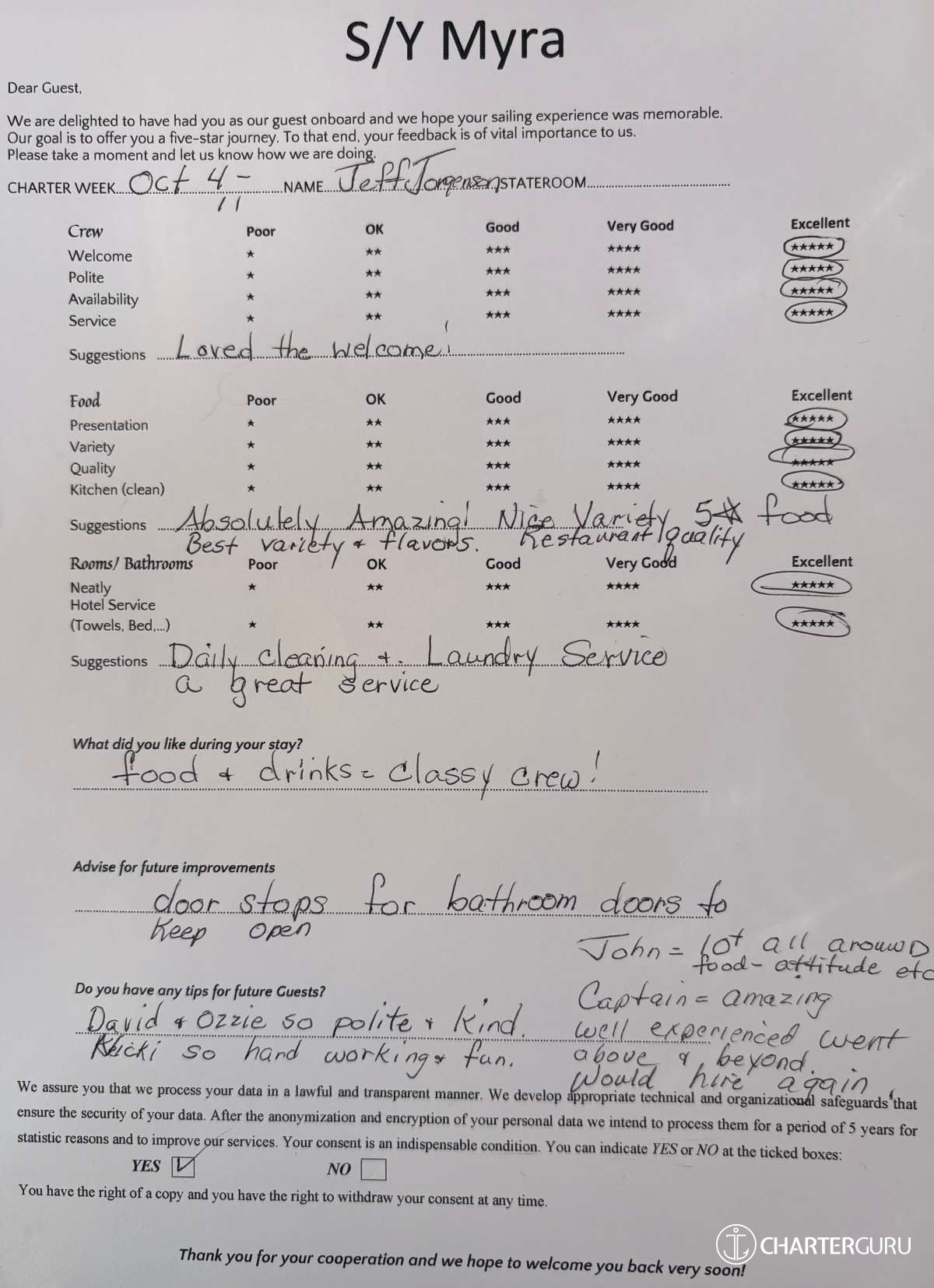 For a sailboat like MYRA, the expected APA is 15% to 30% of the charter price (€3,750 - €7,500), making the charter cost €28,750 to €32,500. Exact amount will be confirmed after inquiry.