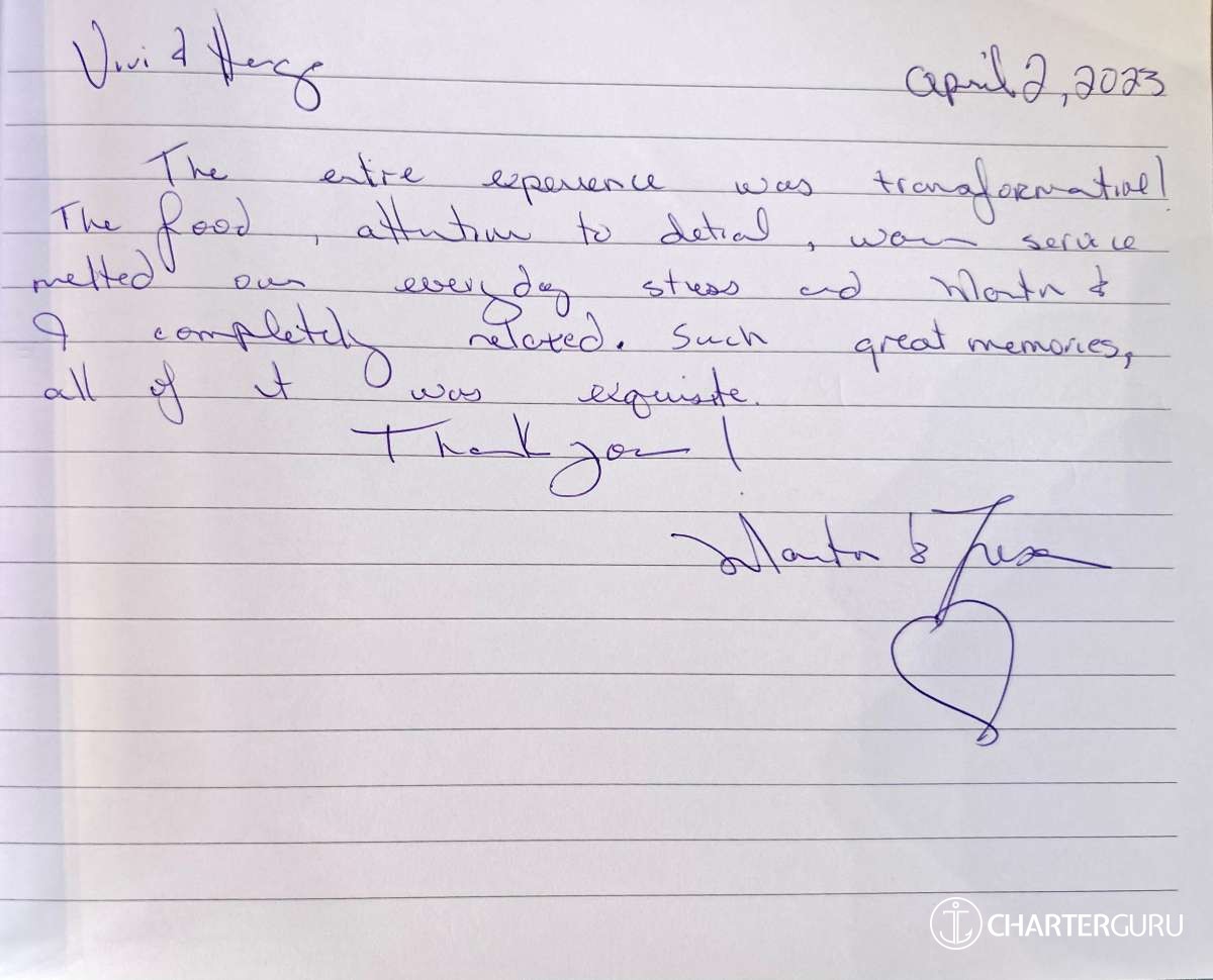 The first thing we want to say is THANK YOU. We sort of had an idea of what our trip was going to be like, but we had no idea it was going to be that glorious. Segundo Viento is an immaculate yacht with every perk we could have asked for. We felt completely at home while also being treated with the utmost respect and genuine care. All of the little details that went into building the catamaran were definitely noticed and appreciated: the monogrammed/logo’d EVERYTHING, the connectivity options (wifi, music, TV streaming services), the “rain” showers in our bathrooms. We seriously cannot stop talking about the trip. It’s also really hard to convey to everyone back home just how wonderful it was to be on board.
