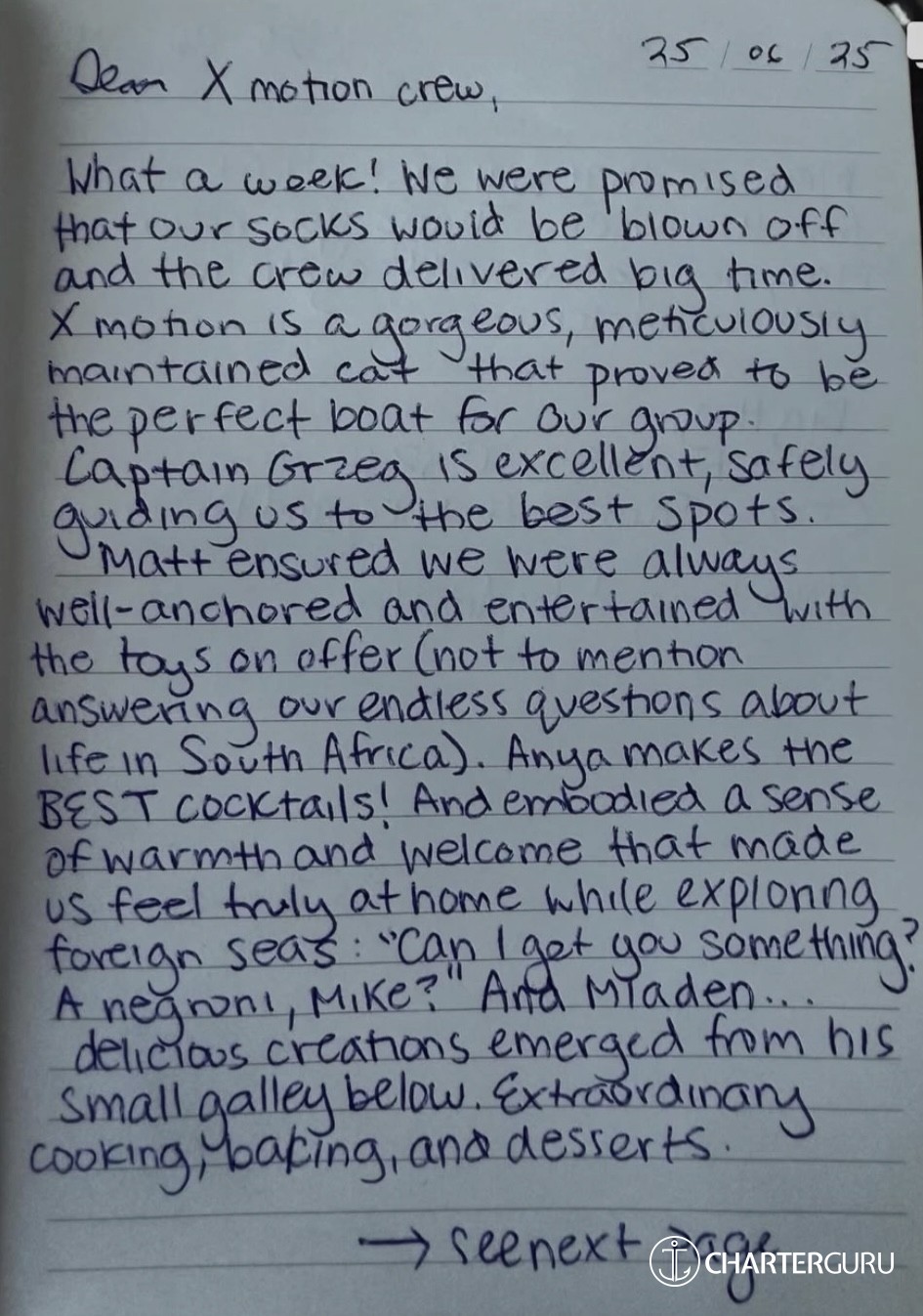 What a week! We were promised that our socks would be blown off and the crew delivered big time. X Motion is a gorgeous, meticulously maintained cat that proved to be the perfect boat for our group. Captain Grzeg is excellent, safely guiding us to the best spots.